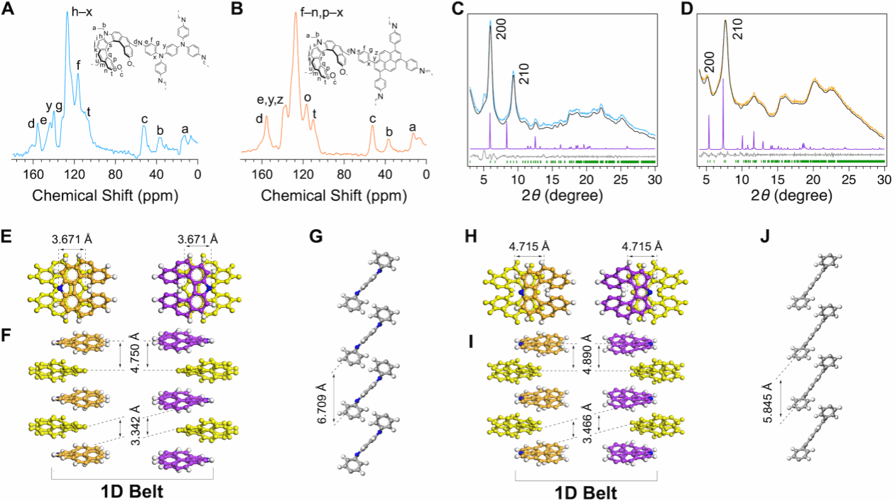 针对这一问题,团队设计合成了咔唑稠合[7]螺烯单体,该单体呈现V型几何结构,两个反应位点夹角104°、垂直间距4.4 Å,这种非常规结构本与传统一维框架生长模式不兼容。研究团队创新性地将其与四取代C₂对称π结单体(TPDA、PyTTA)缩合,得到了具有二重互穿结构的一维带状COFs,实现了拓扑禁阻结构的精准构筑,这也是首次发现一维COFs可形成互穿结构,打破了此前仅三维COFs存在互穿的认知,相关研究成果发表于国际顶级化学期刊《Journal of the American Chemical Society》。SWAG直播