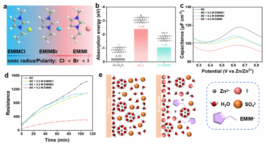 此外,研究团队以离子液体为模型体系,针对锌负极界面副反应严重的问题,提出了利用吸附作用调控界面微环境的优化策略。在此基础上,系统论述了卤素阴离子(Cl⁻、Br⁻、I⁻)在电极/电解液界面的特异性吸附行为及其作用机制。研究表明,I⁻最易在内亥姆霍兹层形成致密且稳定的化学吸附层,可有效均匀化界面电场与离子分布,引导锌的均匀沉积/剥离,并显著抑制副反应。得益于该界面调控机制,采用I⁻修饰的Zn//Zn对称电池在1.0 mA·cm⁻2条件下实现了超过4900小时的超长稳定循环,库仑效率高达99.7%。相关成果以“Interfacial Engineering via Halide Anion derived Specific Adsorption toward Regulated Deposition Kinetics for Zn Metal Anodes”为题发表于国际知名期刊ChemSusChem(DOI:10.1002/cssc.70522,第一作者为硕士生解冰清、博士生李佳忆,通讯作者为苏龙副研究员、高新培教授、鲁飞教授。)
