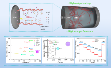 针对水系锌离子电池输出电压低、倍率性能差等瓶颈问题,研究团队制备了一种双阳离子聚阴离子电解质(DCPE)。该体系以2-丙烯酰胺-2-甲基丙磺酸(AMPS)的锌盐和锂盐为前驱体,通过原位光聚合构建富含羰基与酰胺基团的聚合物骨架。该骨架有效重构水分子氢键网络,将电化学稳定窗口拓宽至4 V以上;同时,聚阴离子结构通过限制阴离子迁移显著抑制浓差极化,大幅提升倍率性能。引入的锂离子使体系能够适配锂离子电池高压正极,从根本上突破水系电池的电压瓶颈。电化学测试表明,基于DCPE的Zn||LMO全电池实现了2.1 V的高输出电压与108.46 mAh/g的比容量,在0.5 A/g下循环1000次后容量保持率达73.3%,循环寿命较传统液态电解质提升5.6倍。该研究为开发兼具高电压与高倍率性能的水系储能体系提供了新思路。相关成果发表于Journal of Energy Storage(DOI: 10.1016/j.est.2025.119863,第一作者为联合培养硕士生吴嘉鸣,通讯作者为山东石油化工学院谢丰金博士、高新培教授、山东大学郑利强教授)。