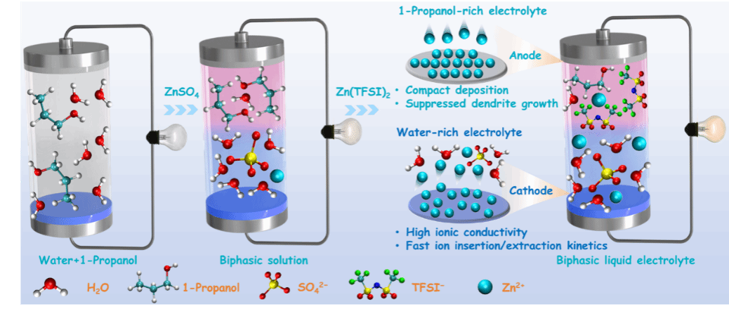 传统水系锌离子电池电解液多通过抑制水活性来稳定锌负极,但这往往以牺牲离子传导为代价,难以同时满足正、负极的差异化需求。近日,研究团队基于亲水效应,提出一种由盐析效应驱动的水/有机双相电解质设计新策略。研究表明,水与正丙醇本为互溶体系,但高电荷密度的硫酸根离子所带来的强亲水效应,可调控体系内分子间相互作用,进而通过阴离子特异性热力学作用实现对电解液相行为的精准调控。所构建的双相电解液包含两个独立的反应室:富含丙醇的阳极定制电解质可有效抑制水引发的副反应并促进均匀锌沉积,在200次循环中实现99.1%的平均库仑效率,并赋予对称电池超过6800小时的超长循环寿命;富水的阴极定制电解质则兼具优异的离子电导率,其残留有机组分还能协同优化阴极/电解质界面,加速Zn2+的嵌入/脱出动力学。该工作为设计满足正负极差异化需求的先进电解质提供了全新视角。相关成果以“Kosmotropic-effect-driven biphasic aqueous electrolyte towards durable zinc-ion batteries”为题发表于国际知名期刊Green Chemistry (DOI:10.1039/d5gc06218g,第一作者为博士生贺连纹,通讯作者为潘福生教授、高新培教授、鲁飞教授。)