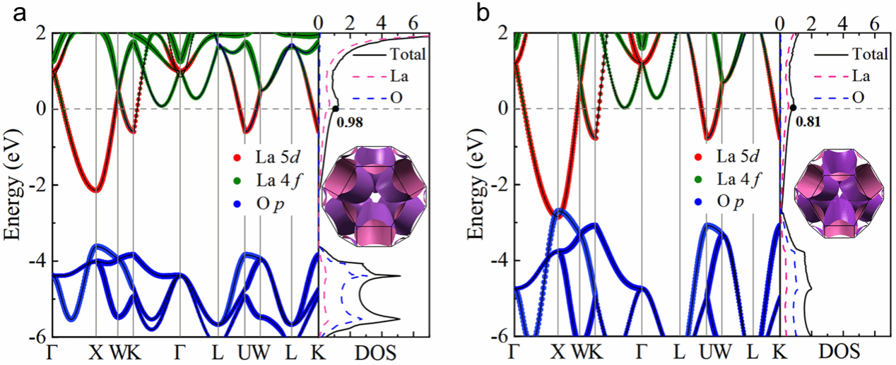 理论分析进一步揭示,压缩应变显著增强了La-5d与O-2p轨道的杂化,促使费米面重构为三维多口袋拓扑,这种结构有利于自旋或轨道涨落作为配对媒介,从而驱动非常规超导。