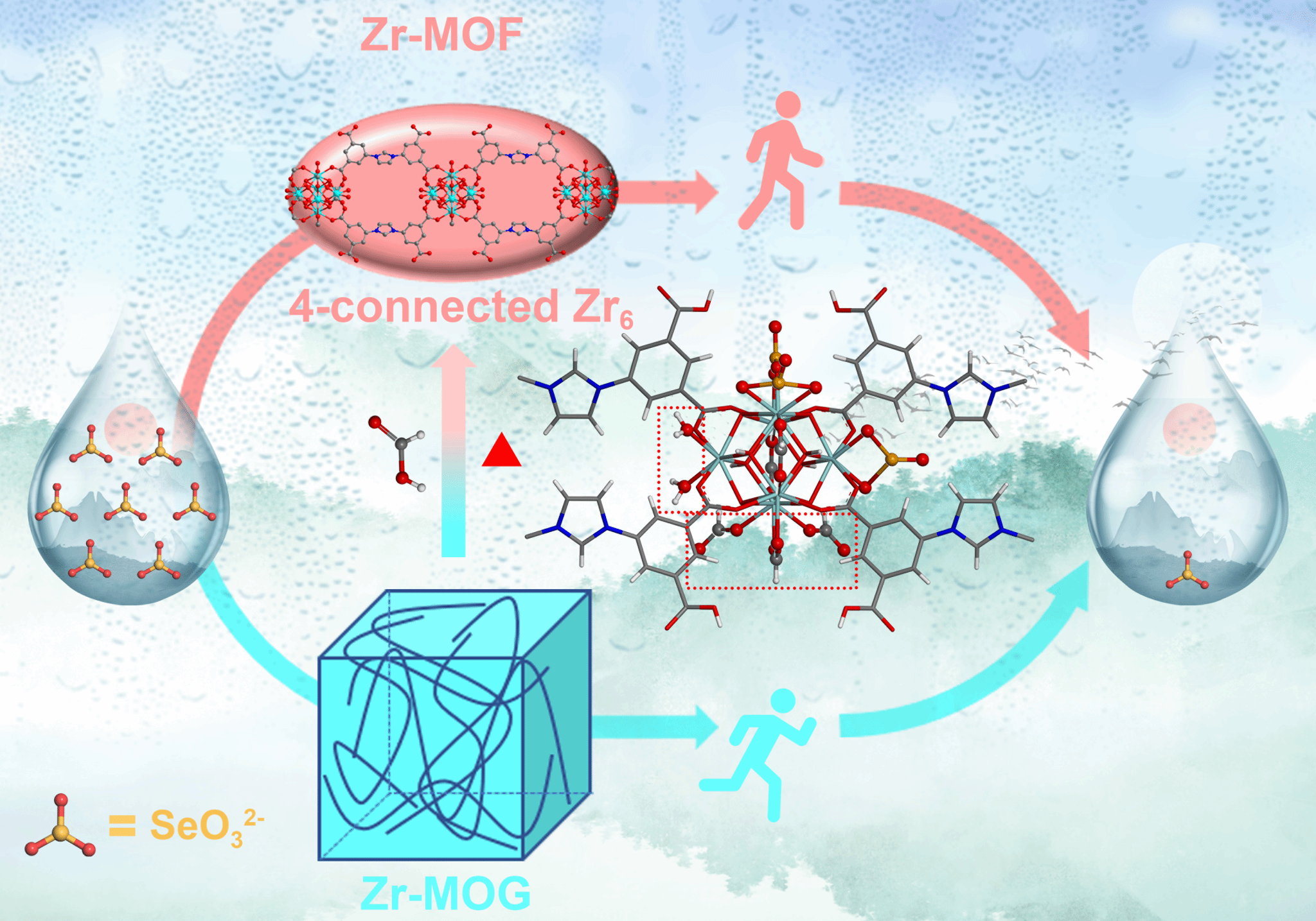 先进功能多孔材料团队在水环境Se(IV)污染物高效去除领域取得新进展。团队基于Zr6簇的不饱和开放位点,成功设计并合成了对Se(IV)具有高吸附量的4-连接Zr-MOF(HNU-88)。其中间体的金属有机凝胶材料(HNU-G8),实现了对水环境水体中Se(IV)的快速吸附去除。相关研究成果以“Unlocking open metal sites in Zr-MOF/MOG for efficient and rapid Se(IV) adsorption”为题发表于期刊《Science China Chemistry》(中国科学院一区Top,IF=9.7),论文链接://engine.scichina.com/doi/10.1007/s11426-026-3401-3。博士研究生周琪为论文第一作者,任国建副教授和潘勤鹤教授为论文共同通讯作者。